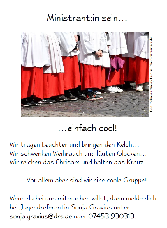 Zuständig für die Mini-Arbeit auf SE-Ebene ist die Jugendreferentin Sonja Gravius. Du erreichst sie unter sonja.gravius@drs.de oder unter 07453 930313. Sie freut sich über jede Anfrage 🙂 Grundsätzlich aber kannst du dich jederzeit an alle wenden, die in der Kirche arbeiten, ob Pfarrer, Sekretärin oder Mesnerin. Entweder, sie können deine Fragen direkt beantworten oder sie leiten dich an die Jugendreferentin weiter. Außerdem kannst du dich immer auch an die Minis wenden, die du aus dem Gottesdienst in deiner Kirchengemeinde kennst. Sie helfen dir bestimmt alle gerne weiter!